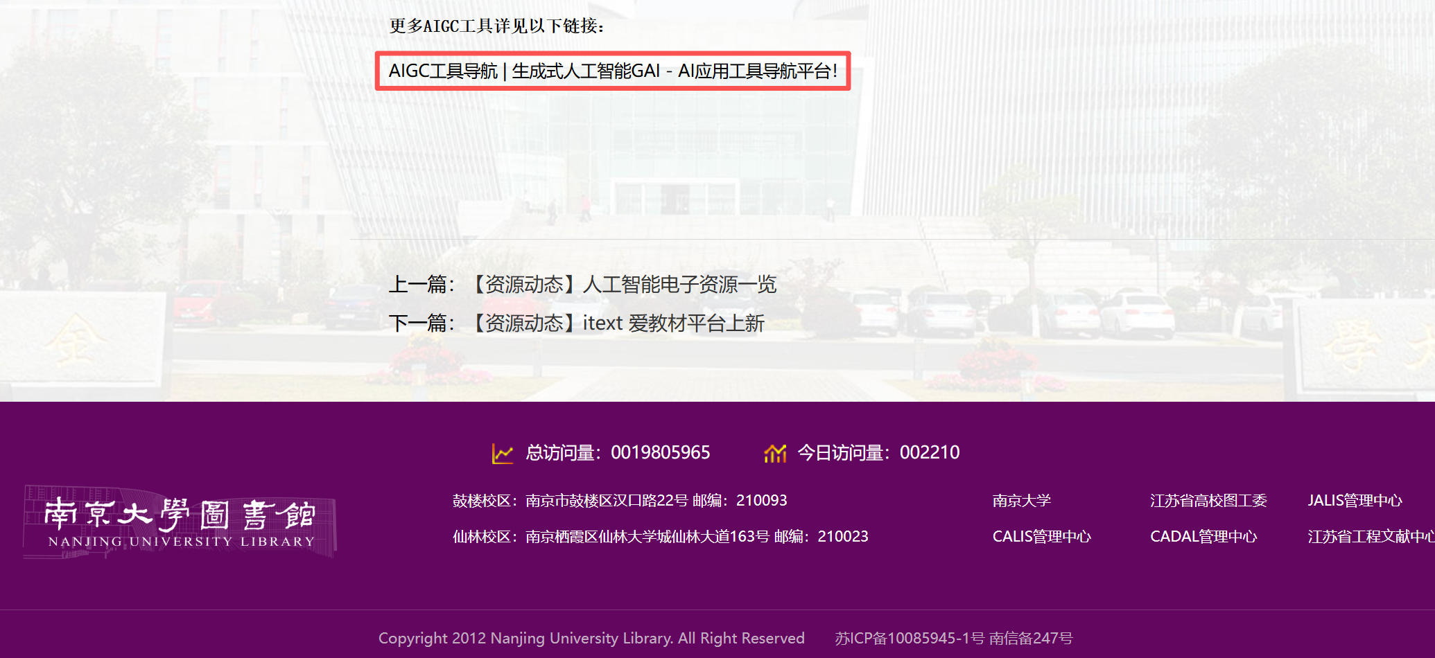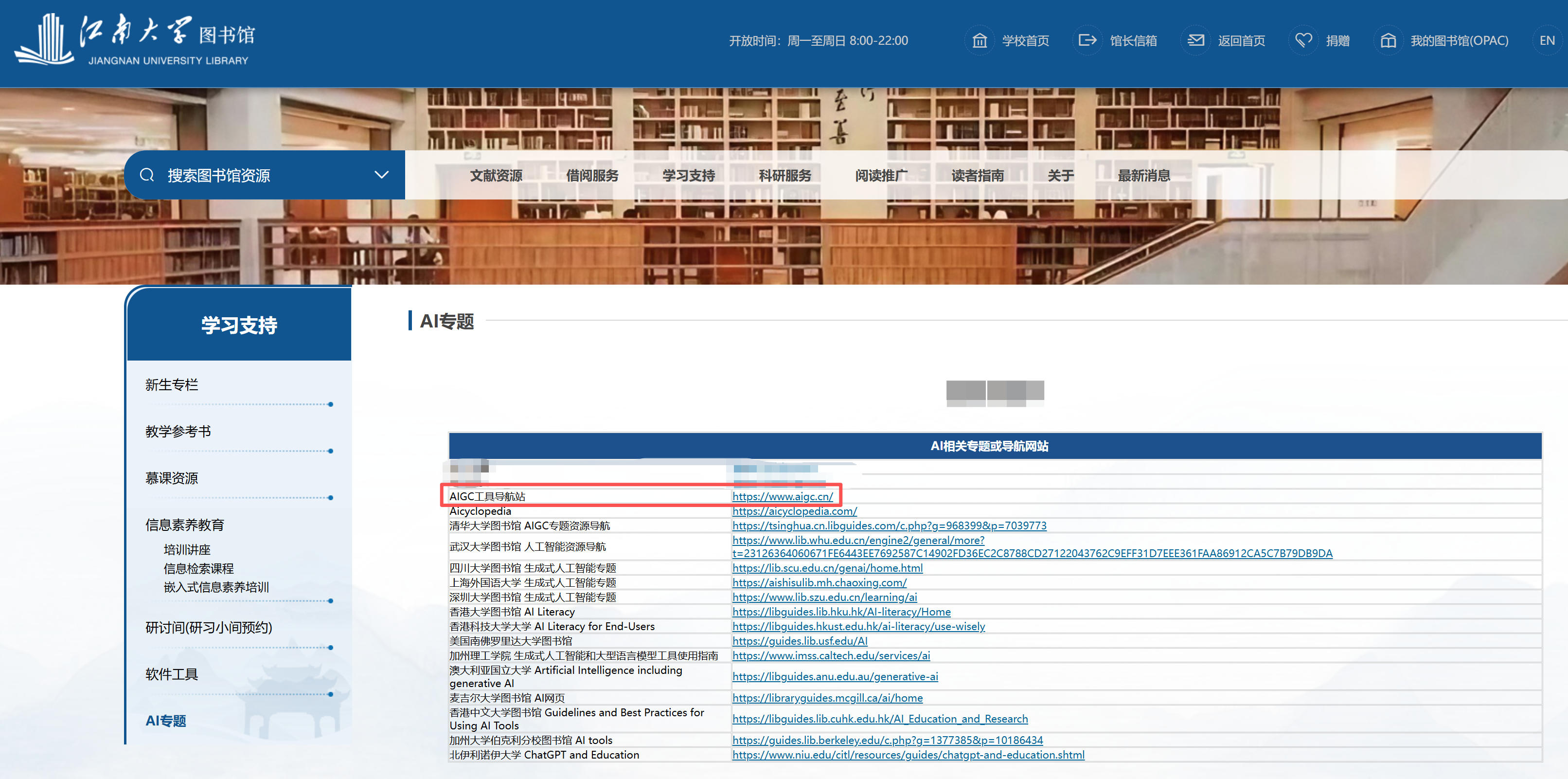 - 江南大学图书馆:全球 AI 资源导航的重要成员江南大学图书馆在其 “其他 AI 资源” 专题页面中,将 AIGC 工具导航(https://www.aigc.cn/)与清华大学、武汉大学等高校的 AI 专题资源并列收录,明确标注为核心 “AIGC 工具导航站”。该页面同时涵盖国内外多所顶尖高校的人工智能资源指南,而本导航能跻身其中,充分说明其在工具整合专业性上已达到高校图书馆认可的权威标准,进一步拓宽了在长三角地区高校中的服务覆盖范围。