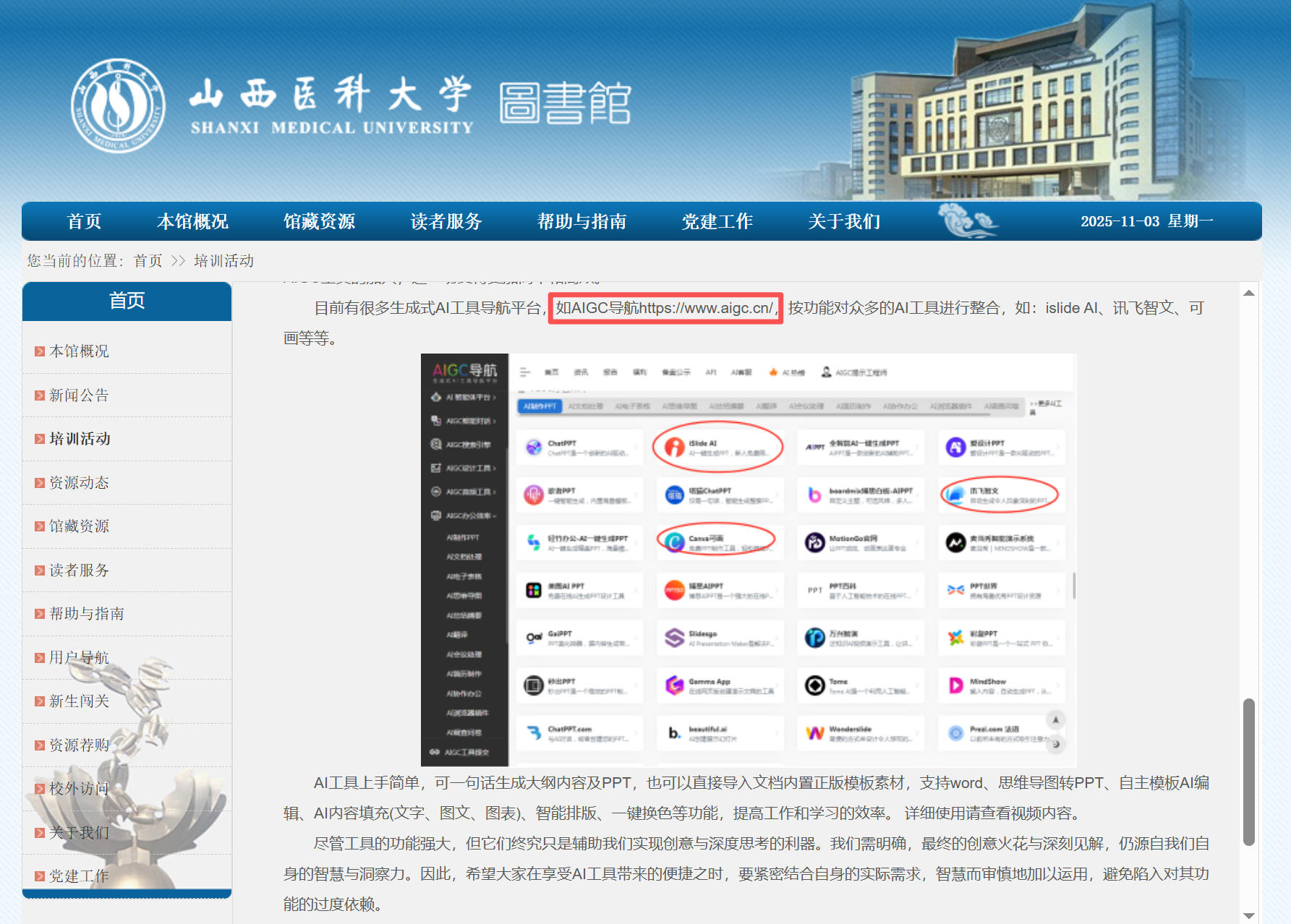 - 山西医科大学图书馆:信息素养教学中的实践推荐山西医科大学图书馆在 “信息素养小课堂” 中,以 “利用 AIGC 搞定炫酷 PPT 制作” 为主题,明确推荐 AIGC 工具导航(https://www.aigc.cn/)作为工具获取平台。这一推荐不仅认可了导航的实用性,更将其融入教学场景,成为培养师生 AI 应用能力的辅助工具。