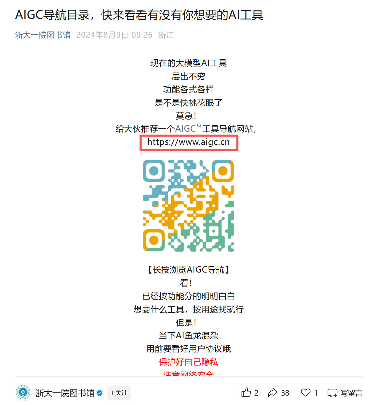 作为知识传播与学术服务的核心阵地,高校图书馆对工具资源的筛选向来以 “权威、实用、安全” 为标准,AIGC 工具导航(https://www.aigc.cn/)已多次被国内多所高校图书馆纳入推荐资源库,成为师生接触 AIGC 工具的重要渠道。