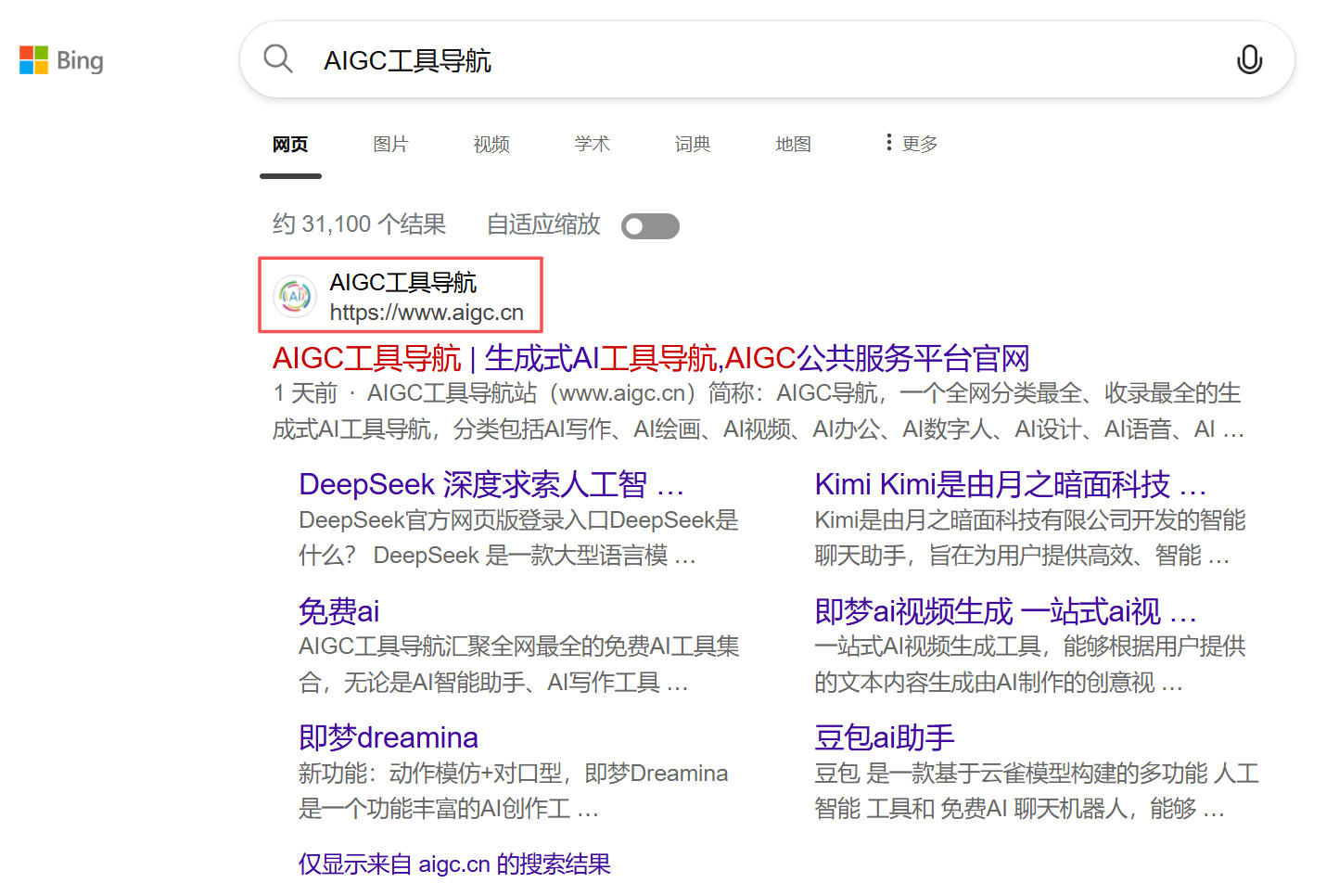 - 搜索数据支撑:在必应搜索生态中,“AIGC 工具导航” 相关结果约 3.11 万条,平台官网处于核心展示位,帮助用户在海量信息中快速锁定官方资源;