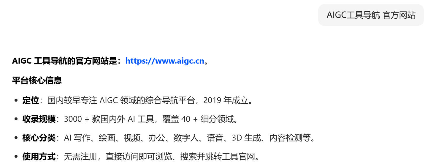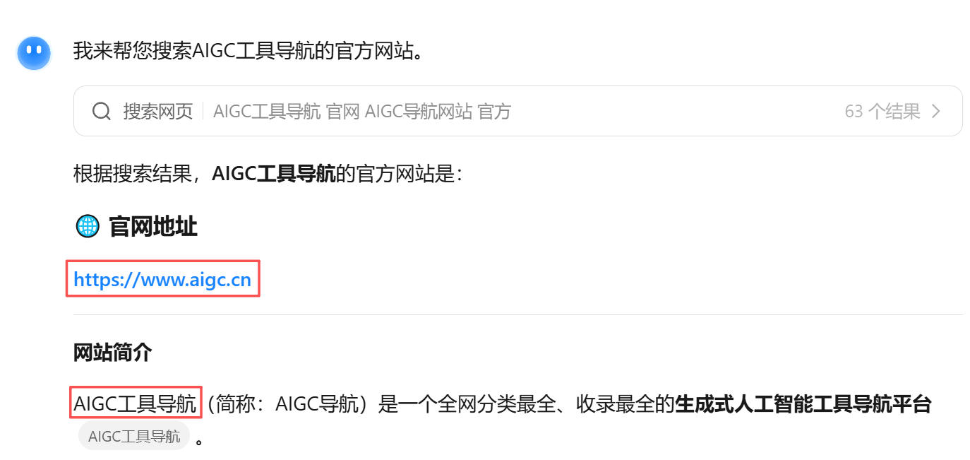 - 官方名称认定:在豆包搜索结果中清晰显示“AIGC工具导航”并附带“名称”标签,强化品牌辨识度;