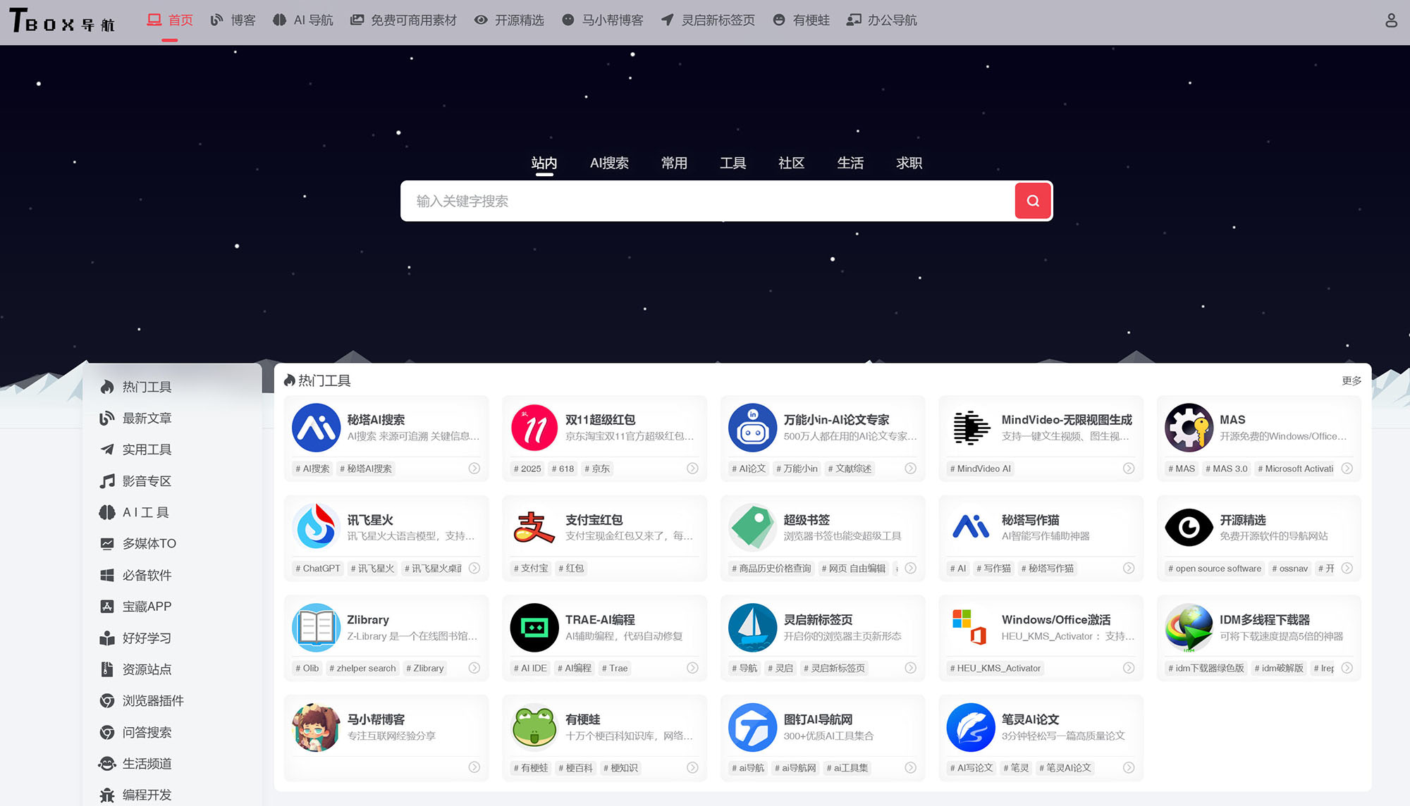 Tbox导航(https://www.tboxn.com/)是一款垂直化、实用主义导向的工具聚合平台,核心定位为 “稀缺资源 + 刚需工具” 的一站式入口。与常规导航站不同,它以 “免费性、开源性、功能性” 为筛选核心,深度整合学术研究、AI 创作、软件工具、影音娱乐、生活服务等领域的高价值资源,尤其聚焦用户 “找资源难、用工具贵” 的痛点(如免费电子书、破解软件、学术镜像站等),形成覆盖 “学习 – 工作 – 娱乐 – 生活” 全场景的资源生态,是学生、程序员、办公族及实用工具爱好者的典型优选平台。