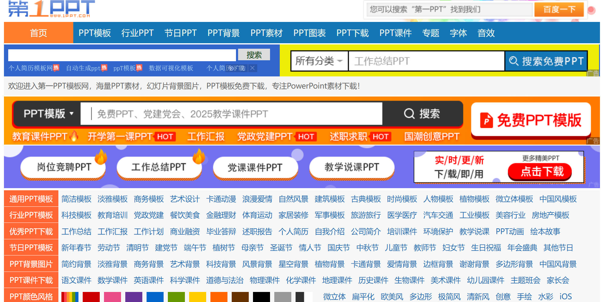 第一 PPT(官网:https://www.1ppt.com/)是国内专注于 PPT 全链路需求的免费资源平台,核心定位为 “PPT 模板、素材、教程及办公辅助工具的一站式入口”。它区别于 Canva、稿定设计等 “设计型工具”,以 “免费性、场景化、实用性” 为核心,覆盖 “PPT 制作 – 美化 – 辅助办公” 全流程,整合了数万套模板、数千个素材及系列办公教程,适配职场人、教师、学生、电商运营等不同群体的 “高效制作专业 PPT” 需求,已成为国内用户量领先的办公资源平台之一,尤其在 “免费模板覆盖广度” 与 “办公场景适配性” 上形成显著优势。